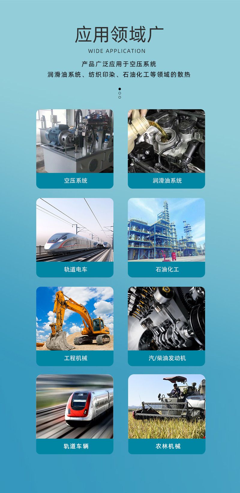 - 应用场景 :挖掘机、装载机、起重机等设备的液压油冷却,防止油温过高导致粘度下降、密封失效或元件磨损。