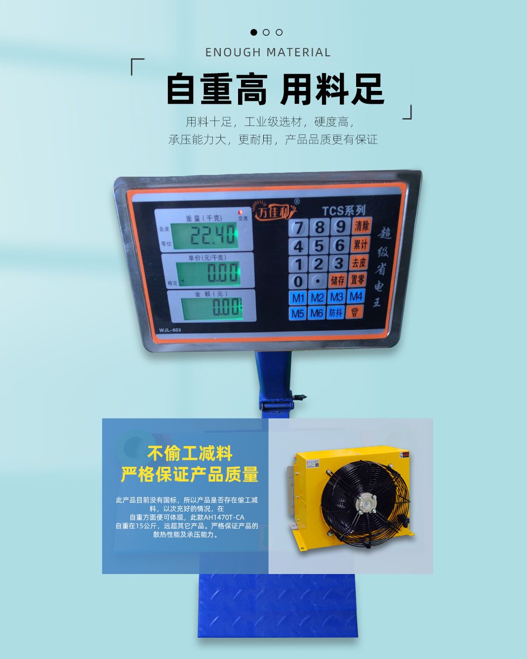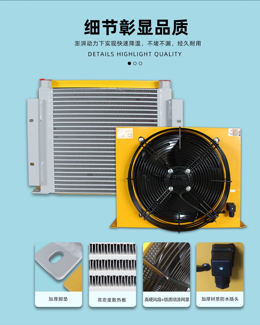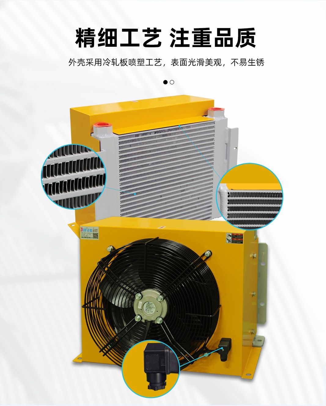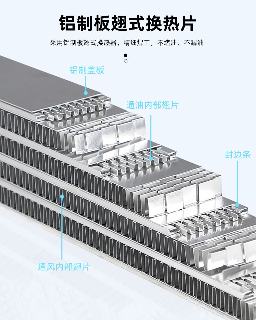 - 换热效率 :采用铝制板翅式结构(类似CPU散热器),翅片密集且表面积大,搭配轴流风机强制对流,散热功率可达 10-50 kW (视型号而定),可将油温稳定控制在 40-60℃ (理想工作温度范围)。